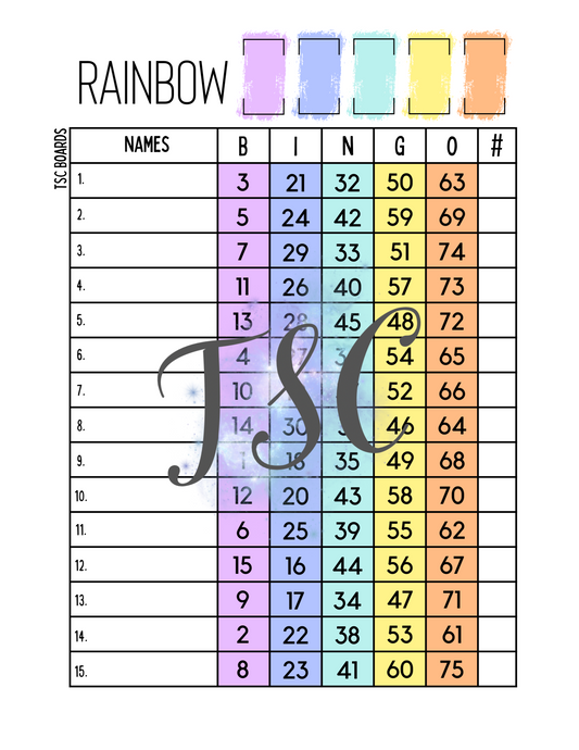 Rainbow Bundle 20 Bingo Boards 1-75 Ball 1-15 Line